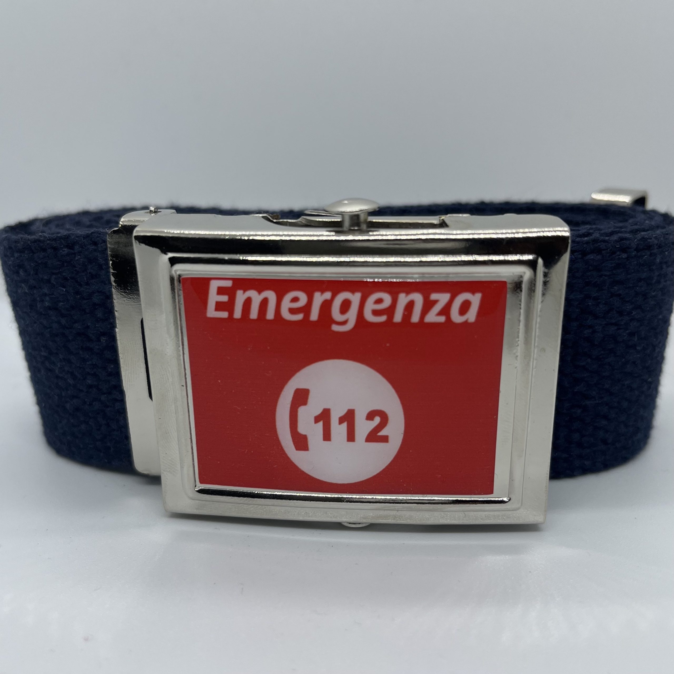 Cintura con fibbia 112 Emergenza. Nastro Colore Blu in poliestere-cotone altezza 40 mm. Fibbia in metallo con scasso per proteggere gelatina con logo. Disponibile nelle misure 120 cm, 140 cm e 160 cm. Misure più grandi su ordinazione. Possibilità di avere loghi personalizzati. Telefonare o scrivere a info@ricamificiosal.it