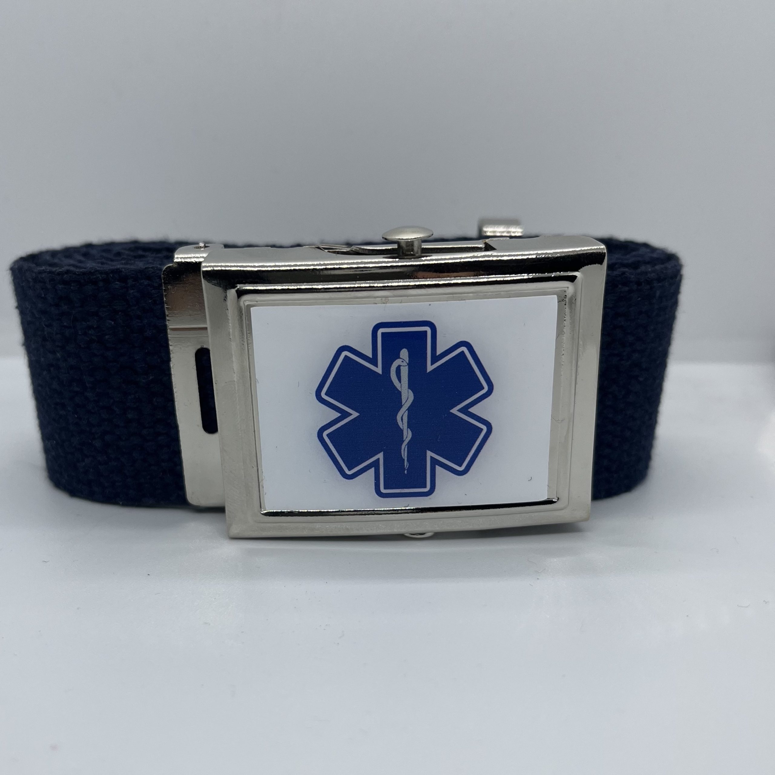 Cintura con fibbia Esculapio. Nastro Colore Blu in poliestere-cotone altezza 40 mm. Fibbia in metallo con scasso per proteggere gelatina con logo. Disponibile nelle misure 120 cm, 140 cm e 160 cm. Misure più grandi su ordinazione. Possibilità di avere loghi personalizzati. Telefonare o scrivere a info@ricamificiosal.it